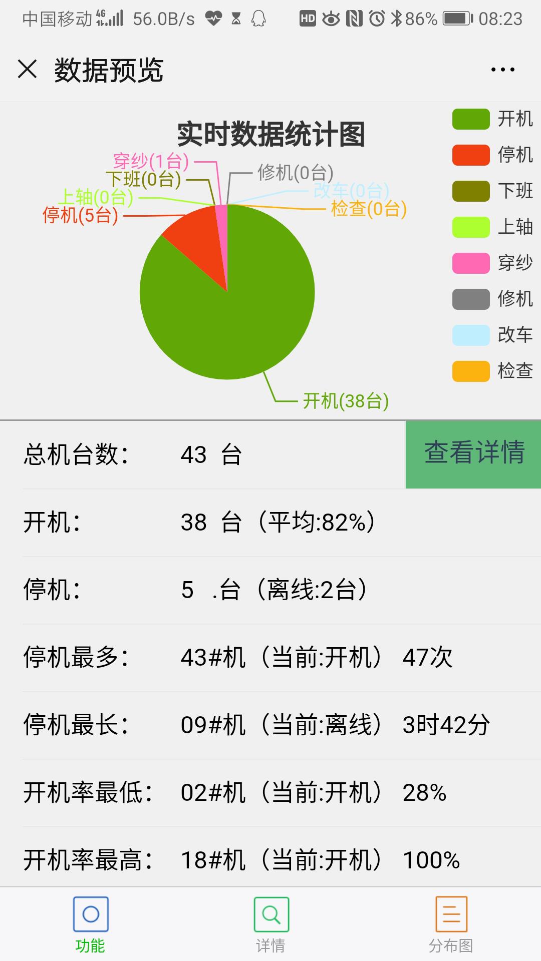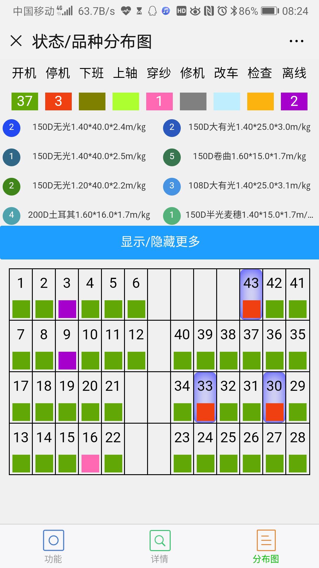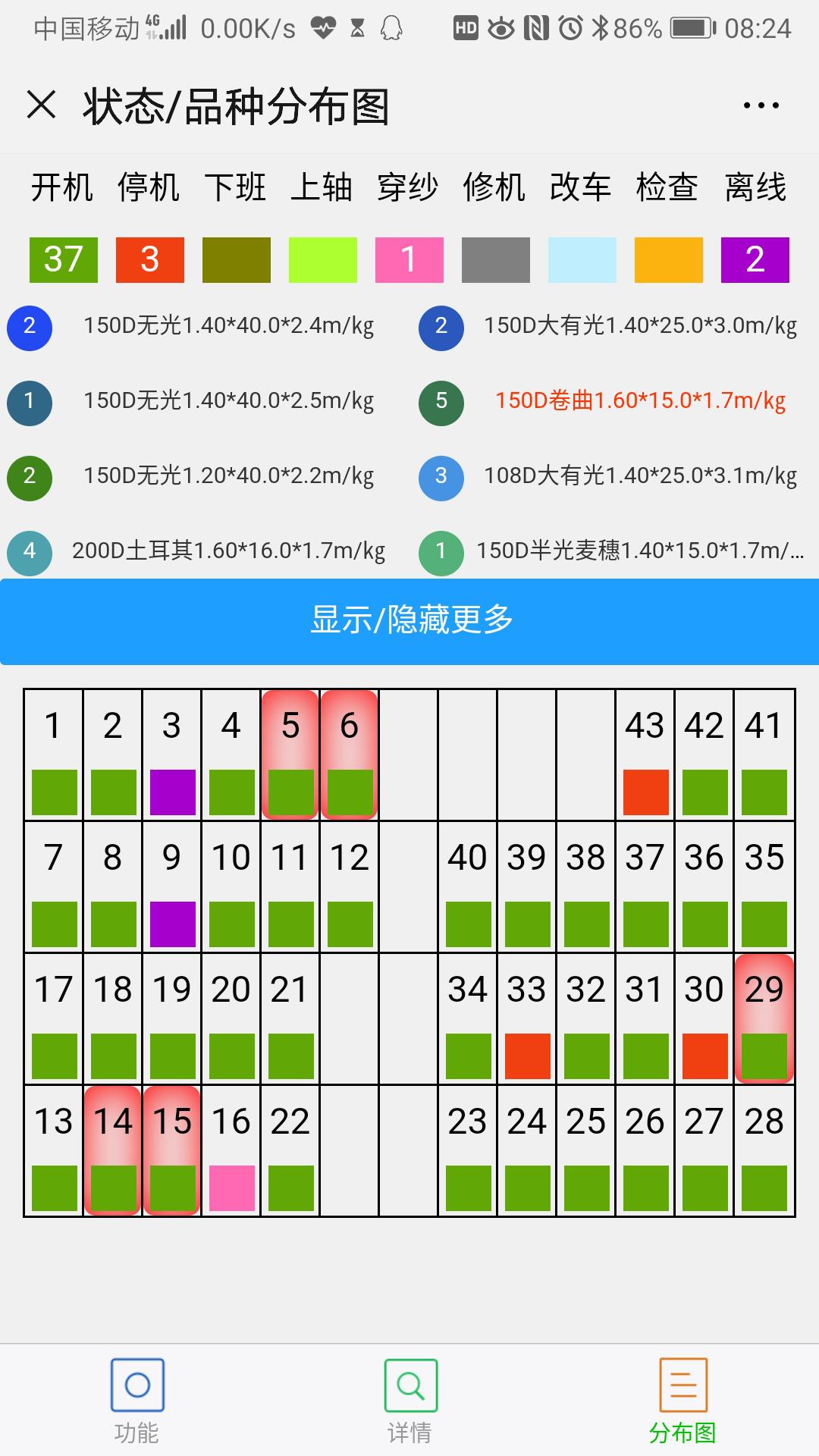 实时监控机器状态如:挡车工、转速、停机次数、开机率、品种规格、长度、重量等,尽在掌握之中。