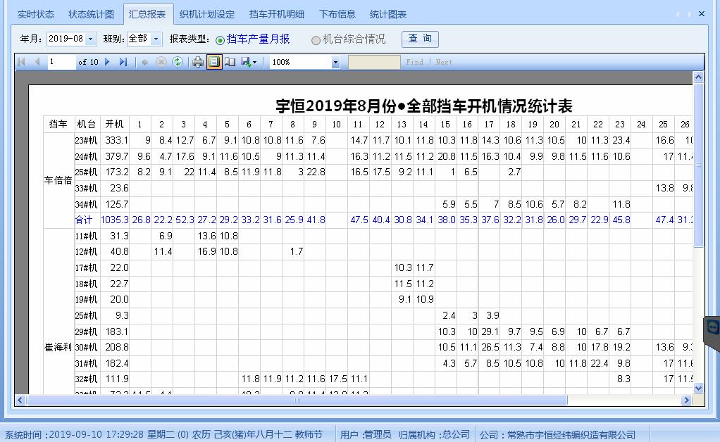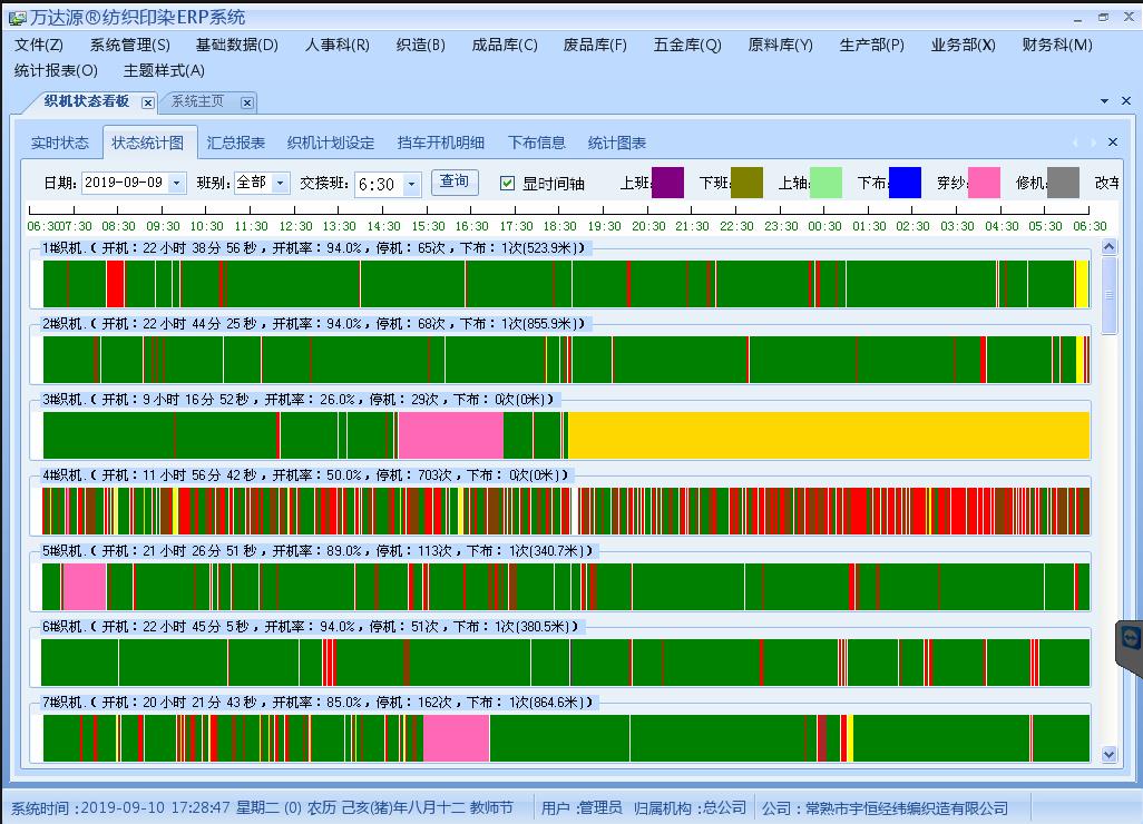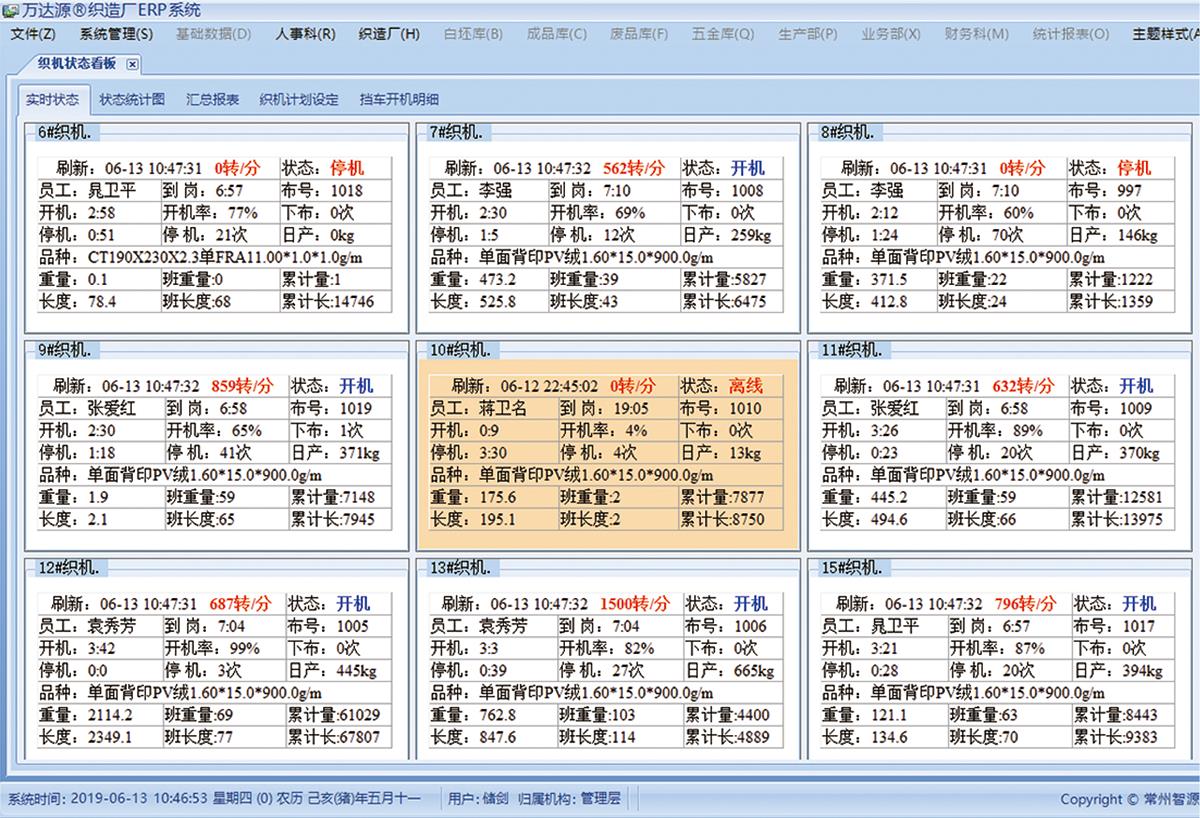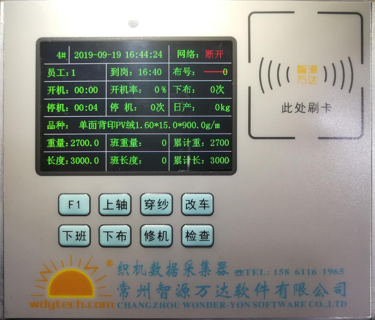 可自动计量:开停机、穿纱、修机、改车、上轴等用时情况;记录下布次数及每匹布的长度、重量;自动统计挡车工负责的机台数,以及每台机的工时产量,自动生成日报表、月报表。