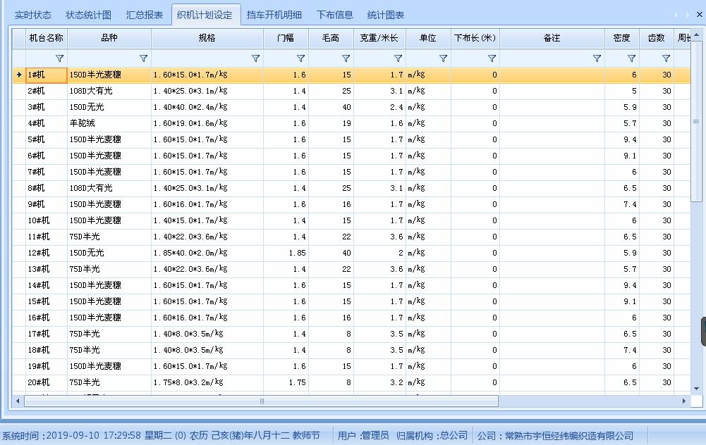 可设置每台机所做品种规格,设置单匹下布长度(达到设定长度后系统自动报警提示下布),设置每台机的密度、辊周长等参数,可查看和清零累计数。
